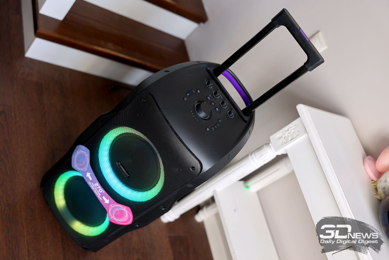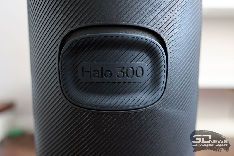 E não, esta “mala” tem uma alça — está no lugar mais esperado, telescópico. Ao lado dela, há uma alça comum, caso você ainda precise levantar o alto-falante e arrastá-lo para algum lugar. Por exemplo, para o porta-malas de um carro. Normalmente, quando falamos de gadgets, experimentamos nos bolsos, bolsas ou mochilas — aqui a medida é diferente. O volume do Halo 300 é de cerca de 150 litros (805 × 455 × 412 mm), ou seja, ele deve caber mais ou menos em qualquer porta-malas, mas pode haver nuances. Este é o dispositivo “portátil” que você precisa considerar para transportá-lo no carro.