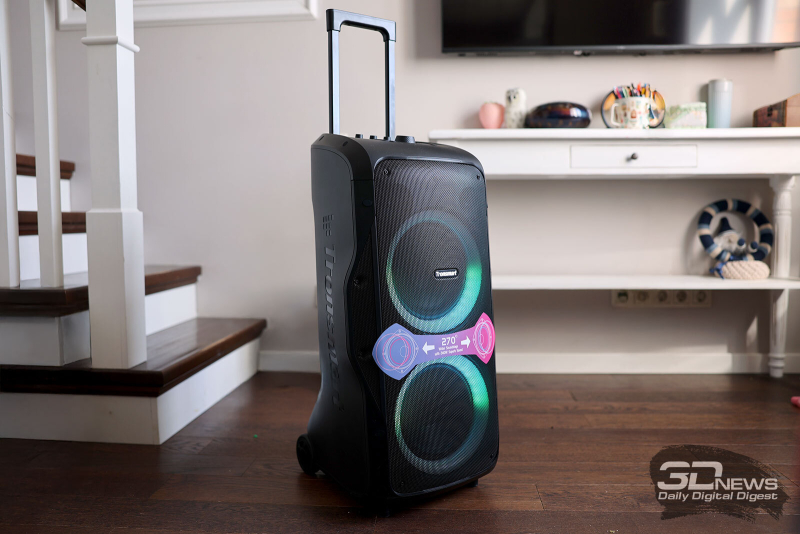 O Tronsmart Halo 300 é um sistema construído de acordo com o esquema 2.2. Vemos aqui dois woofers com diâmetro de oito polegadas e um alto-falante de médios (três polegadas) e agudos (2,5 polegadas). A potência total é de impressionantes 240 W. O nível declarado de pressão sonora alcançado é de 111 dB.