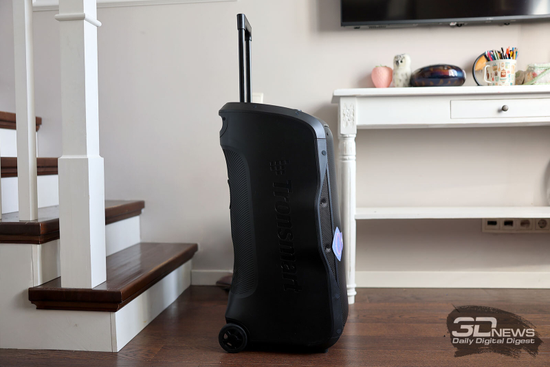 E não, esta “mala” tem uma alça — está no lugar mais esperado, telescópico. Ao lado dela, há uma alça comum, caso você ainda precise levantar o alto-falante e arrastá-lo para algum lugar. Por exemplo, para o porta-malas de um carro. Normalmente, quando falamos de gadgets, experimentamos nos bolsos, bolsas ou mochilas — aqui a medida é diferente. O volume do Halo 300 é de cerca de 150 litros (805 × 455 × 412 mm), ou seja, ele deve caber mais ou menos em qualquer porta-malas, mas pode haver nuances. Este é o dispositivo “portátil” que você precisa considerar para transportá-lo no carro.