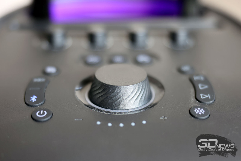 A bateria interna de 99,9 Wh (11,1 V, 9000 mAh) deve durar 20 horas de reprodução contínua com volume de 50% e com os efeitos de iluminação desligados. Não medi o quanto isso corresponde à realidade, mas aparentemente está bem próximo da realidade — você pode contar com 12 a 15 horas com a luz de fundo ligada. O sistema é carregado diretamente da rede elétrica (100-240 V) e uma carga completa do zero leva 4 horas.