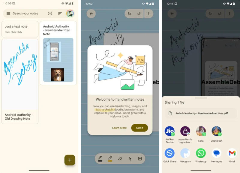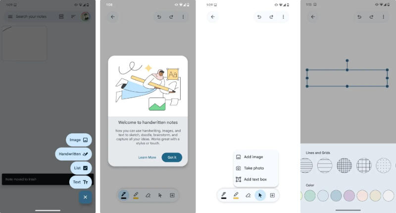 Os jornalistas do Android Authority conseguiram ativar a interface do usuário para notas manuscritas – o novo formato aparecerá além do formato de desenho já presente no Google Keep. As ferramentas Caneta e Seleção têm a mesma aparência, o controle deslizante de largura do traço recebeu uma aparência atualizada e a interface de seleção de cores também mudou. Ao clicar no botão com ícone de adição, você será solicitado a adicionar uma imagem (com recorte), texto com formatação ou tirar uma foto; O cursor permite mover objetos adicionados à tela.