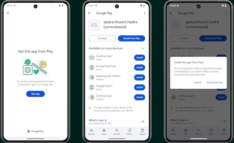 Na conferência de desenvolvedores Google I/O em maio, a empresa também exibiu diálogos de “remediação” que oferecem soluções para problemas de integridade. Portanto, se a consulta “appLicensingVerdict” retornou o resultado “UNLICENSED”, significa que o usuário não possui licença para o aplicativo – ele não o comprou ou instalou no Google Play. Nesse caso, você também pode chamar a API Play Integrity, que exibirá uma janela “GET_LICENSED” que o ajudará a obter o aplicativo na app store oficial. O aplicativo existente será excluído com todos os seus dados, o sistema instalará uma instância “oficial”, o aplicativo será adicionado à biblioteca da loja e todas as solicitações adicionais de “appLicensingVerdict” retornarão “LICENSED”.
