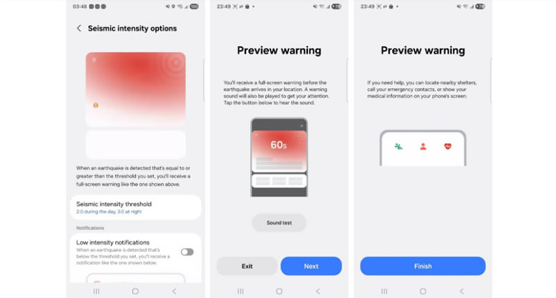 A Samsung está desenvolvendo seu próprio sistema de alerta de terremotos, que oferece mais recursos que o do Google. Um recurso projetado para alertar usuários sobre eventos sísmicos foi descoberto na versão beta do One UI 8. De acordo com a descrição, ele consegue reconhecer terremotos e exibir um alerta pouco antes de os tremores atingirem a localização do usuário. As notificações aparecem como uma mensagem em tela cheia com um sinal sonoro.