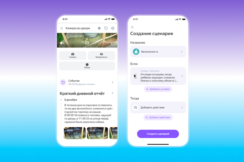 Agora, a câmera Yandex notifica os usuários sobre tudo o que acontece dentro do campo de visão — ela pode detectar especificamente, por exemplo, que as crianças voltaram para casa; todas essas gravações são salvas em um arquivo, permitindo recuperação rápida. Os eventos reconhecidos pela IA dentro do campo de visão podem ser vinculados a cenários de casa inteligente — personalizáveis ​​no aplicativo “Home with Alice”. Por exemplo, se uma criança acordar durante a noite, uma luz noturna acende; quando o cachorro aparecer, um bebedouro automático é acionado; e se o animal de estimação pular no sofá, uma foto é enviada ao dono. Diariamente, a IA gera um resumo dos eventos do dia com base nas descrições e envia uma notificação pelo aplicativo “Home with Alice” — o relatório pode ser visualizado no perfil do dispositivo.