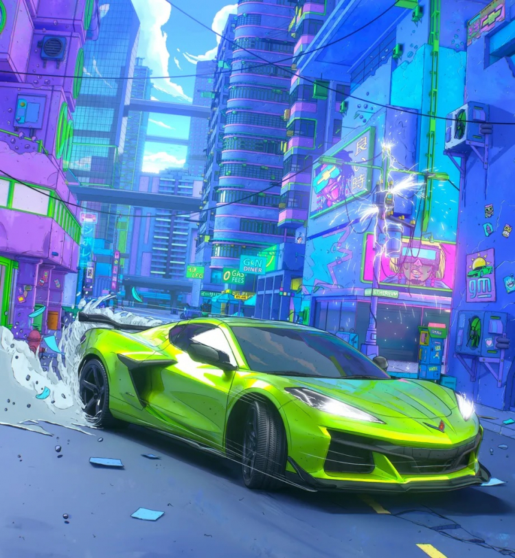 Um token NFT representando um Corvette Z06 verde ácido correndo pelas ruas da cidade foi criado pelo artista Nick Sullo, que também atende pelo pseudônimo xsullo. Além do token NFT, o vencedor do leilão recebeu um Corvette Z06 real em uma cor exclusiva Minted Green. Esta cor não será mais usada para pintar carros esportivos deste modelo. Além disso, o carro esportivo oferecido para leilão possui um número VIN apenas de zeros e uns, como se estivesse em formato binário.