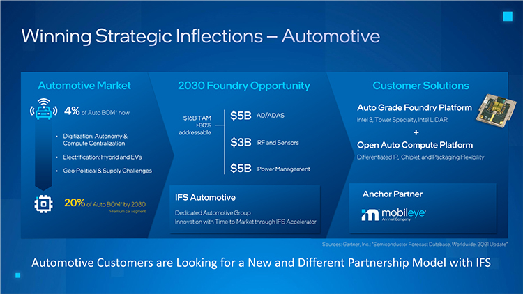 Durante uma reunião com investidores, a Intel anunciou sua intenção de formar um grupo automotivo dedicado dentro de seu próprio negócio de fabricação de semicondutores, a Intel Foundry Services. Essa divisão trabalhará com clientes da indústria automotiva e criará oportunidades lucrativas para que eles interajam com a Intel como fabricante de eletrônicos automotivos.