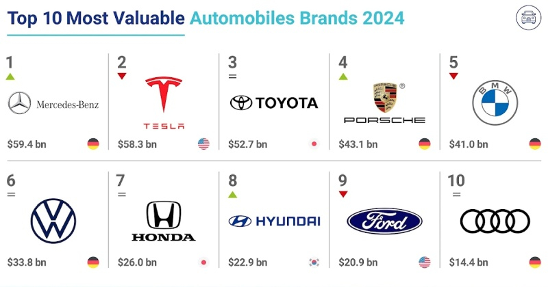 A agência analítica Brand Finance interpreta o valor da marca como o benefício económico líquido de licenciá-la no mercado aberto. A marca pioneira em veículos eléctricos Tesla caiu 12% de preço, para 58,3 mil milhões de dólares em 2024. A queda está associada aos escândalos em torno de Elon Musk, que afectaram negativamente a reputação da sua empresa. Enquanto isso, a marca Mercedes-Benz subiu 1%, para US$ 59,4 bilhões, recuperando o primeiro lugar que perdeu para a Tesla em 2023.