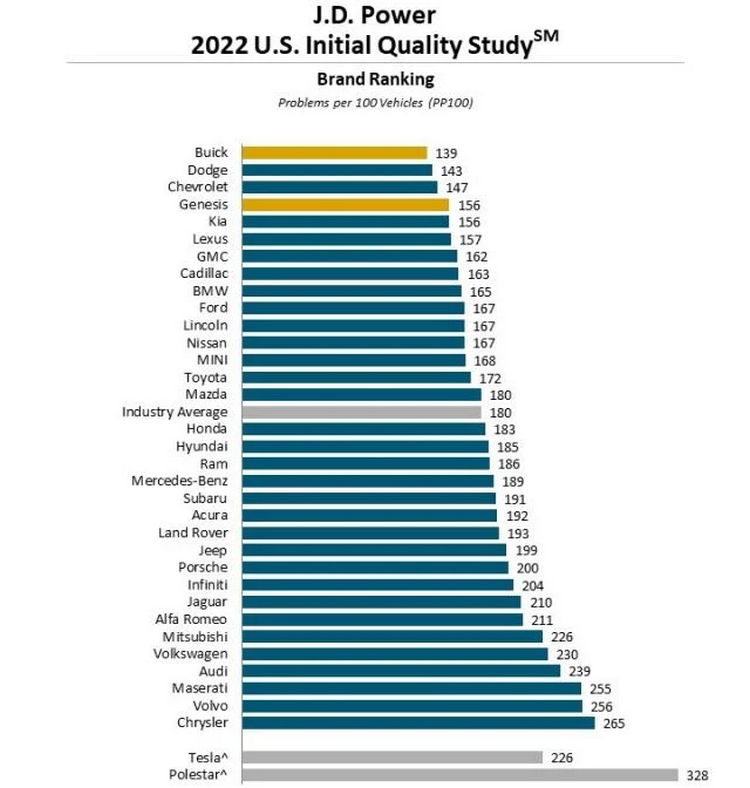 O primeiro lugar em termos de qualidade na classificação JD Power foi conquistado pela marca Buick da GM, que obteve o menor número de problemas por cem carros. Ao mesmo tempo, a GM era geralmente conhecida pela melhor qualidade entre todas as montadoras – 9 de seus carros estavam no ranking dos melhores. O segundo e terceiro lugares, respectivamente, foram para BMW e Hyundai com cinco e três modelos.