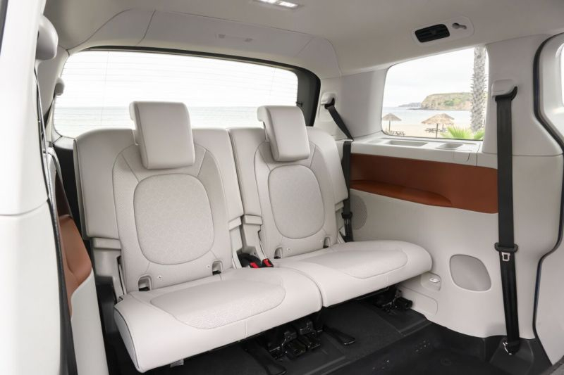 A terceira fila também está equipada com o mínimo necessário de comodidades e ao mesmo tempo deixa algum espaço para bagagem nas costas, mas se necessário pode ser totalmente desmontada. O piso do porta-malas é revestido de plástico e elevado em relação à abertura da porta traseira, mas muitos veículos elétricos pecam por características de layout semelhantes, em que a bateria de tração e os motores elétricos ficam localizados sob o piso do compartimento de passageiros. Especialmente para o mercado norte-americano, onde a novidade aparecerá apenas no próximo ano, três novas opções de cores foram adicionadas ao esquema de cores do modelo, e entre elas também estão combinadas duas tonalidades.