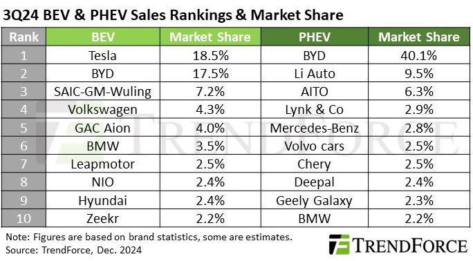 No final de 2024, os especialistas da TrendForce esperam que o mercado de veículos com novos tipos de centrais elétricas cresça 24,8%, para 16,26 milhões de unidades. Os veículos elétricos a bateria foram vendidos no valor de 2,5 milhões de unidades no terceiro trimestre, apresentando um aumento de 3,9% ano a ano. A BYD, embora esteja à frente da Tesla no mercado chinês de veículos elétricos, ainda apenas finge estar em escala global, mas a diferença entre eles é medida em um ponto percentual. Enquanto a Tesla controla 18,5% do mercado global de veículos elétricos, a BYD se contenta com 17,5%. Curiosamente, o terceiro lugar é ocupado pela joint venture SAIC-GM-Wuling, especializada na produção de veículos elétricos compactos e baratos para o mercado chinês. É a sua forte posição no mercado chinês que permite a esta joint venture ocupar o terceiro lugar no ranking mundial com 7,2%.