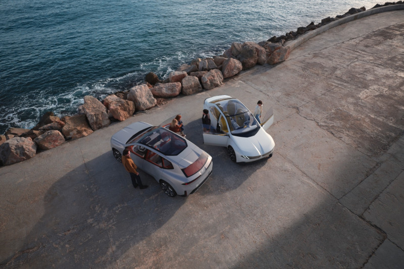 As linhas nítidas na dianteira fluem para a grade vertical redesenhada, que será a marca registrada do BMW X elétrico. A grade do radiador é iluminada e complementada por faróis volumosos que incluem as luzes diurnas do carro. Quando o proprietário se aproxima do carro, as luzes mostram-lhe uma sequência de boas-vindas que transita para a iluminação interior.