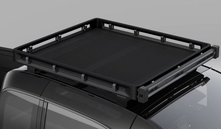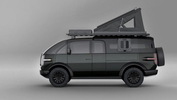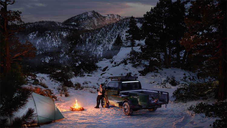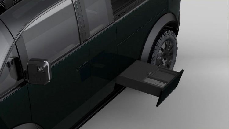 A picape Canoo possui várias superfícies de trabalho dobráveis, uma no nariz do veículo e outra na lateral da carroceria. Você pode estender a plataforma na parte de trás para tornar o espaço ainda mais. O compartimento de armazenamento possui soquetes de 120 V e conectores USB. As imagens promocionais trazem ainda uma versão truck com bagageiro e ainda uma versão Overlander com guarnição de camping e barraca pop-up. Em geral, a empresa tornou seu carro o mais versátil possível.