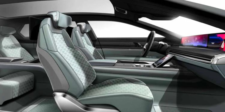 Dos 41 alto-falantes do sistema de entretenimento a bordo de 30 canais, três são orientados para o exterior para imitar os sons de um carro com motor de combustão interna para aqueles ao seu redor. Uma tela de 55 polegadas de duas seções está espalhada pela frente da tela rack-to-pillar, a seção do motorista tem uma densidade de pixels comparável a 8K. O passageiro tem a capacidade de visualizar o vídeo de forma independente sem distrair o motorista através do uso de um filtro polarizador. Cada um dos dois passageiros traseiros conta com uma tela de 12,6 polegadas embutida nas costas dos bancos dianteiros.