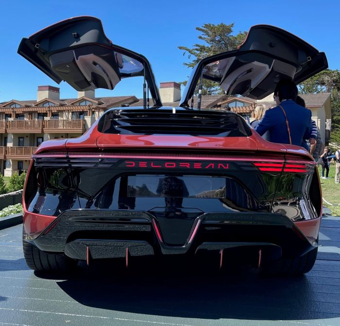 Sob a linha das lanternas traseiras há uma superfície côncava preta brilhante, e a parte inferior do para-choque mostra um difusor maciço ou sua imitação. A janela traseira inclinada do veículo elétrico está equipada com persianas características do modelo clássico DMC-12.
