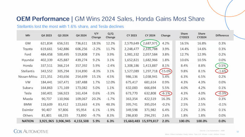 Os analistas fizeram tais conclusões estudando as opiniões de 2557 compradores de carros e 526 revendedores de carros nos Estados Unidos; Especialistas estabelecem o objetivo de entender mais profundamente as relações, preferências e visões de consumidores e vendedores em relação ao transporte elétrico. Com exceção de Stellantis e Tesla, quase todas as montadoras relataram vendas em 2024: os carros da General Motors foram os mais vendidos, Honda e Mazda apresentaram crescimento significativo. A parcela de pessoas que começaram a pensar na compra de um carro elétrico usado aumentou acentuadamente: se em 2021 62 % dos entrevistados admitiram isso, agora já existem 77 %.