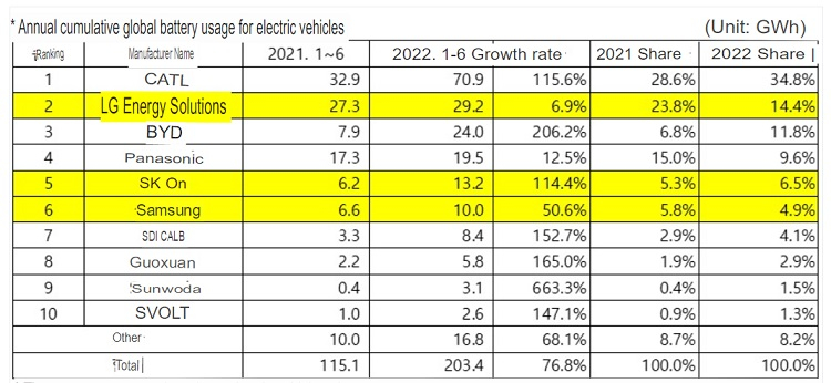 No mesmo período, a chinesa BYD, a terceira maior depois de CATL e LG Energy Solution, aumentou sua participação de mercado de 6,8% para 11,8%. Os dez principais fabricantes incluem seis empresas chinesas (além de CATL e BYD, são CALB, Gotion, Sunwoda e SVOLT), além de três sul-coreanas e japonesas Panasonic.