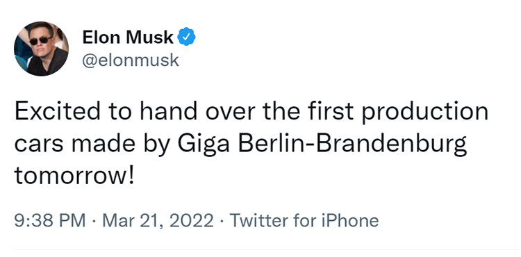 O evento acontecerá apenas alguns dias após a empresa receber permissão das autoridades para iniciar a produção de carros em uma fábrica em Berlim. Ela informou os funcionários da fábrica sobre isso no último sábado. “Parabéns e obrigado a todos que nos ajudaram a fazer isso acontecer. Excelente espírito de equipe. E, claro, não seríamos Tesla se não continuássemos a trabalhar a plena capacidade e já na próxima terça começámos a entregar os primeiros carros aos nossos clientes”, diz a mensagem.