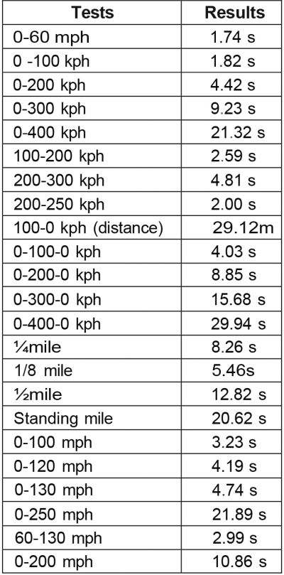O hipercarro croata acelera até aos 200 km/h em 4,42 segundos, arranca a próxima “cem” do zero em 9,23 segundos e ultrapassa a marca dos 400 km/h em 21,32 segundos. Os resultados “transicionais” também viraram recordes: de 100 a 200 km/h o carro acelera em 2,59 segundos, leva 4,81 segundos para acelerar de 200 a 300 km/h, mas de 200 a 250 km/h leva exatamente dois segundos. O hipercarro levou 29,93 segundos para atingir a velocidade de 400 km/h e depois parar completamente, superando o concorrente mais próximo por mais de um segundo.