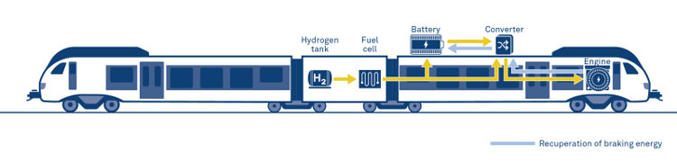 Os motores a hidrogênio sob contrato para os primeiros trens americanos FLIRT H2 serão fabricados pela empresa canadense Ballard Power Systems. Sob este contrato, seis motores de célula de combustível FCmove-HD+ de 100 kW serão fornecidos. Em operação, esse motor emite vapor de água e água condensada, em vez de uma ampla gama de gases de efeito estufa. Esta prática já encontrou algum apoio na Europa, onde uma dúzia ou dois trens movidos a hidrogênio serão colocados em operação em um futuro próximo.