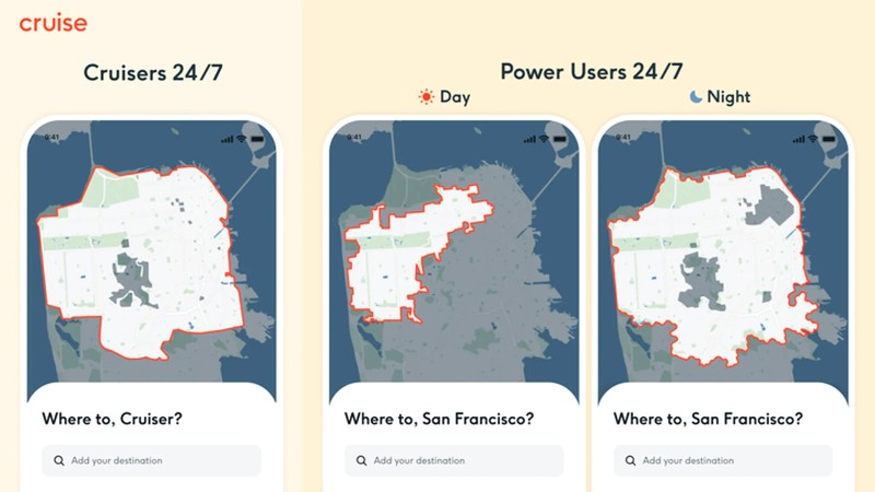 Os clientes que utilizam os serviços de Cruzeiros entre as 22:00 e as 05:30 são cobrados pelas suas viagens. Esses carros estão disponíveis apenas na área noroeste de São Francisco. Enquanto isso, os funcionários da Cruise, também conhecidos como Cruisers, podem dirigir os veículos autônomos da empresa em grande parte da cidade 24 horas por dia, 7 dias por semana.