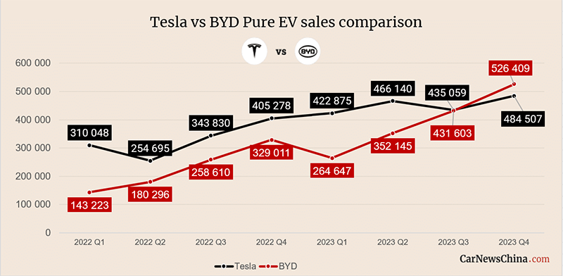 A Tesla vendeu 484.507 veículos elétricos nos últimos três meses de 2023, superando a previsão média dos analistas de 483.173. As vendas da BYD durante o período totalizaram 526.409 veículos elétricos, tornando-a a nova líder no mercado de veículos elétricos, principalmente graças a uma gama muito mais ampla de modelos mais baratos na China.
