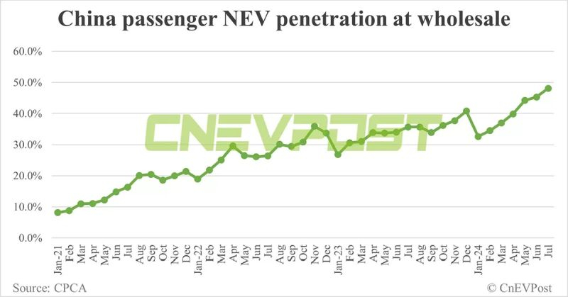 Entre os produtos dos fabricantes chineses, a participação dos NEVs em julho atingiu impressionantes 73,9%, enquanto no segmento de luxo como um todo o número não ultrapassou os 27%. As montadoras estrangeiras que possuem joint ventures com parceiros chineses ofereceram veículos híbridos e elétricos em apenas 8,3% dos casos em julho. As exportações de NEVs de passageiros da China no final de julho aumentaram 1,3% em relação ao ano anterior, para 92.000 unidades, um aumento sequencial de 18,2%. No geral, quase um em cada quatro veículos novos enviados para fora da China em Julho era um veículo híbrido ou eléctrico, sendo que este último representou 72,7% das exportações de Julho.