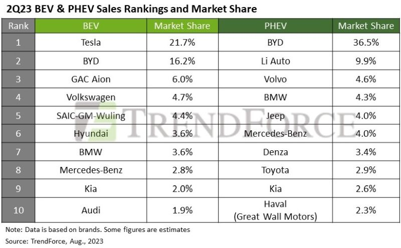 No segmento de híbridos plug-in, que vendeu 876.000 unidades (+52,9%) no segundo trimestre, a BYD tornou-se líder indiscutível com 36,5% do mercado global. Além disso, cerca de dois terços das vendas trimestrais de máquinas desse tipo foram fornecidas pelo mercado chinês. A subsidiária Denza conseguiu subir para a sétima posição no ranking dos maiores players do segmento com 3,4% de share. Em segundo lugar está a Li Auto, que entregou um recorde de 87.000 híbridos no trimestre e ocupou 9,9% do segmento. Em terceiro lugar está a marca nominalmente sueca Volvo, de propriedade da Geely, que controla 4,6% do mercado global de híbridos recarregáveis. A BMW é um pouco inferior a ela com 4,3% do mercado, mas entre os membros desta lista, exceto nas duas primeiras posições, a competição mútua geralmente é muito alta. Jeep e Mercedes-Benz, por exemplo controlam 4% do mercado cada uma, sendo esta última também relacionada aos produtos Denza. A ancestral da classe híbrida, a japonesa Toyota, se contenta com a oitava colocação e 2,9% do mercado, mas ainda não há tantas opções de plug-in no sortimento de seus modelos, e elas se concentram principalmente nos mercados do Japão e da América do Norte.