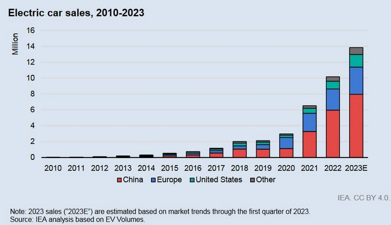 Um novo relatório da Agência Internacional de Energia afirma que as vendas globais de veículos elétricos crescerão mais de um terço em 2023, para 14 milhões de unidades, levando os veículos elétricos a quase um quinto do mercado de carros novos até o final do ano. Ao mesmo tempo, constatou-se que no ano passado as vendas de veículos elétricos deram um salto de 55% e ultrapassaram 10 milhões de unidades.