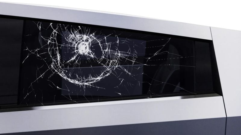 Outro acessório interessante é um adesivo que imita a marca causada por uma bola de metal batendo no vidro da porta traseira esquerda de uma caminhonete. Você pode comprar esse adesivo na loja da marca Tesla por US$ 55; ele vai imitar um incidente ocorrido há quatro anos, quando na primeira etapa da apresentação do Cybertruck, representantes da empresa tentaram demonstrar a capacidade do vidro à prova de balas nas portas de uma picape caminhão para suportar impactos de objetos metálicos. Aliás, apareceu então uma rachadura no vidro da porta do motorista, mas foi proibido aplicar adesivo nele para manter melhor visibilidade, então o acessório foi adaptado para a porta traseira esquerda. A propósito, na apresentação de hoje do Cybertruck, um representante da empresa jogou suavemente uma bola de beisebol nas janelas laterais, então Tesla ainda não se atreveu a reproduzir as condições do experimento de quatro anos atrás.