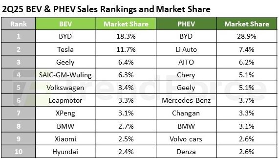 No segmento híbrido plug-in, a BYD ocupa 28,9% e, portanto, lidera o mercado mundial com uma margem enorme sobre a Li Auto (Lixiang), que está em segundo lugar com uma participação de mercado de 7,4% e pode se orgulhar de um aumento no volume de vendas de 11%. A marca Aito, apoiada pela Huawei, ficou em terceiro lugar com uma participação de 6,2%, e a Chery e a Geely receberam 5,1% do segmento cada. Em sexto lugar, a posição do premium alemão é defendida pela Mercedes-Benz com 3,7% do mercado, mas entre ela e a BMW, que se estabeleceu em oitavo lugar (3,1%), está a chinesa Changan com 3,3%. A sueca Volvo Cars, de propriedade da Geely, ocupa o nono lugar com 2,6% do mercado, e a Denza, em décimo lugar, tem a mesma participação. Esta marca foi criada como uma joint venture entre a BYD e a Mercedes-Benz, mas agora é totalmente de propriedade da antiga montadora. A estreia do modelo N9 permitiu à Denza não apenas aumentar as vendas em 41%, mas também entrar no top dez pela primeira vez.