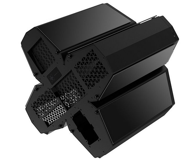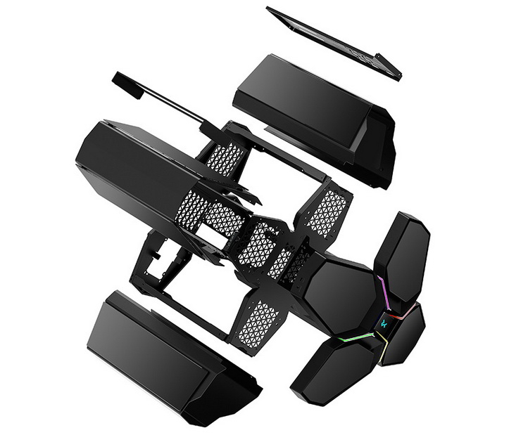 O Quadstellar Infinity possui seis painéis de vidro temperado que oferecem uma perspectiva única para a exibição de componentes individualmente. Há uma cápsula separada para cada componente principal do PC. Os painéis frontais de cada cápsula podem ser abertos para fluxo de ar adicional.