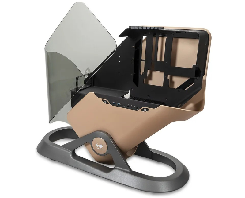 O case é preso a um suporte especial por meio de uma dobradiça motorizada, decorada com o logotipo InWin. O fabricante observa que a dobradiça foi exaustivamente testada para mais de 1.500 ciclos de movimento. O suporte foi fundido em areia em uma única peça de alumínio para garantir máxima resistência estrutural e confiabilidade.