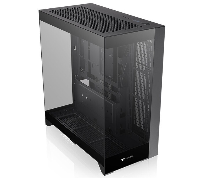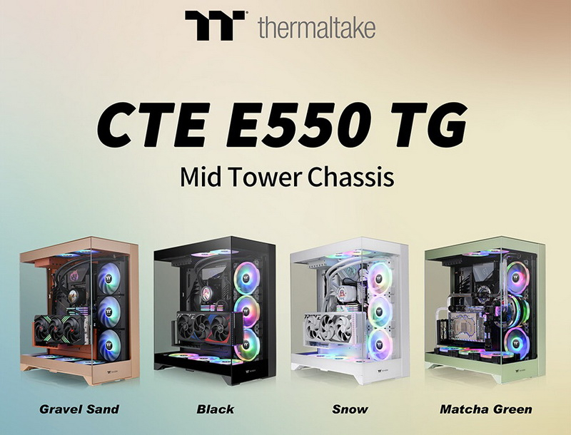 A Thermaltake apresentou o gabinete CTE E550 TG em formato Mid-Tower, cujas partes frontal e traseira, assim como uma de suas paredes laterais, são feitas de vidro temperado com 4 mm de espessura. Graças a isso, a caixa oferece uma visão panorâmica dos componentes nela instalados.