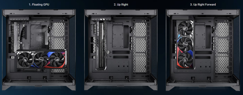 O design especial do assento da GPU, bem como a ausência da habitual parede traseira para conectores externos no gabinete, criam o efeito de uma placa de vídeo “flutuando” no ar.