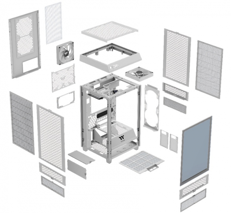 O gabinete tem duas ventoinhas CT140 de 140 mm pré-instaladas (uma na parte superior e outra na parte traseira). No total, o Tower 200 Mini permite instalar até seis ventoinhas: uma de 120mm ou 140mm na parte superior, duas de 120mm ou 140mm na parede direita, duas de 120mm ou 140mm na parede traseira e ainda uma de 120mm ou 140mm cada um no topo da caixa que separa a fonte de alimentação de outros componentes. Em vez de um par de ventiladores, um radiador SZhO de 240 ou 280 mm pode ser colocado na parede direita. De cima, você pode instalar um radiador de 120 ou 140 mm.