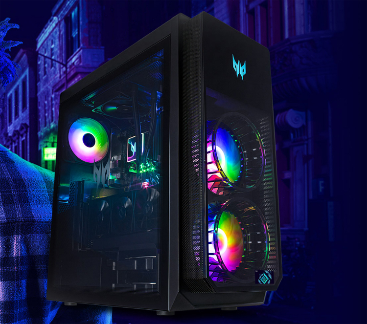O desktop é feito em um case espetacular. Na frente estão dois novos ventiladores Predator FrostBlade 2.0 ARGB. Cada um desses resfriadores é equipado com oito LEDs e usa um design especial para otimizar o fluxo de ar enquanto reduz a vibração e o ruído, graças aos rolamentos de parafuso vedados e novos elementos arqueados nas pontas das lâminas.