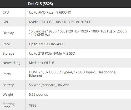 Um laptop para jogos Dell G15 (5525) mais acessível também foi lançado, a partir de US$ 899. Ele está pronto para oferecer um processador Ryzen 9 6900HX e placas gráficas da série GeForce RTX 3000. Existem modelos GeForce RTX 3050, RTX 3050 Ti, RTX 3060 e RTX 3070 Ti para escolher. Não há opções com placas gráficas AMD. O laptop está equipado com uma tela de 15,6 polegadas. Podem ser painéis 1080p com taxa de atualização de 120 ou 165Hz, ou uma tela 2K com taxa de atualização de 240Hz.