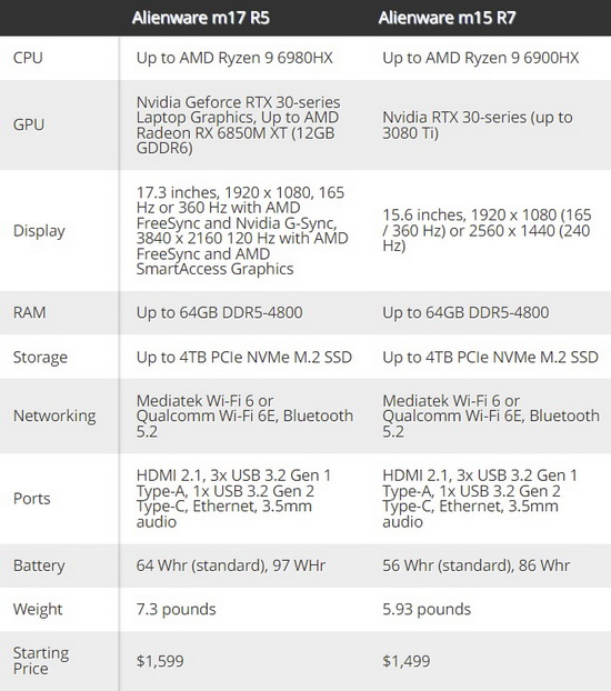 O Alienware m15 R7 de 15 polegadas menor, pesando 2,7 kg, custa a partir de US$ 1.499. Na configuração máxima, a novidade vem equipada com um Ryzen 9 6900HX de oito núcleos com frequência de até 4,9 GHz, além de uma placa de vídeo GeForce RTX 3080 Ti. A escolha em favor dos aceleradores discretos da AMD não é fornecida aqui. Este modelo de laptop também oferece três telas para escolher: resolução de 1080p com taxa de atualização de 165 ou 360 Hz ou painel 2K com taxa de atualização de 240 Hz.