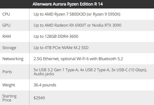 O desktop para jogos Alienware Aurora Ryzen Edition R14 não é novidade. No entanto, o fabricante oferece uma nova configuração para ele, a partir de US$ 2.949. Inclui um processador Ryzen 7 5800X3D de 8 núcleos e 16 threads com 96 MB de cache L3 e uma frequência de até 4,5 GHz.