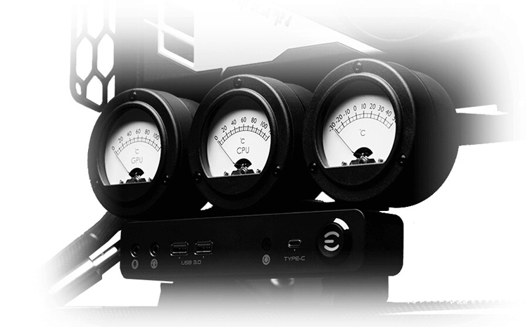 Na parte inferior do computador há um bloco com três dispositivos analógicos: eles informam sobre a temperatura dos gráficos e processadores centrais, assim como de todo o sistema como um todo. Há também conectores de fone de ouvido e microfone, duas portas USB 3.0 e um conector USB tipo C.