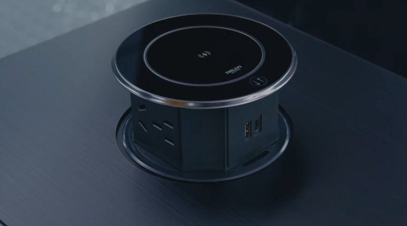No lado esquerdo do DK-07 há um hub USB retrátil integrado com múltiplas portas, carregamento sem fio e uma tomada elétrica completa. Há também um porta-copos embutido com função de resfriamento.