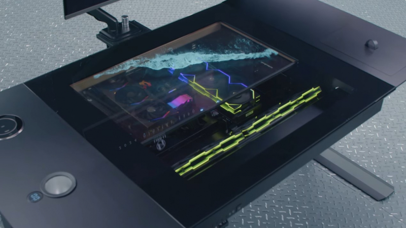 A parte central da mesa DK-07 é revestida com vidro “inteligente” de 8 mm de espessura, que pode se tornar transparente ou fosco ao pressionar um botão. Sob o vidro está uma tela OLED transparente de 30 polegadas da LG. Pode ser usado como segundo monitor.
