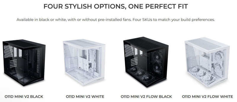 A Lian Li anunciou o lançamento do gabinete compacto para computador O11D MINI V2, tipo aquário. Ele está disponível em duas versões: regular e Flow. Esta última possui cinco ventoinhas de 120 mm pré-instaladas. A diferença de preço entre as versões regular e Flow é de apenas US$ 10 — US$ 89,99 contra US$ 99,99 do Flow.