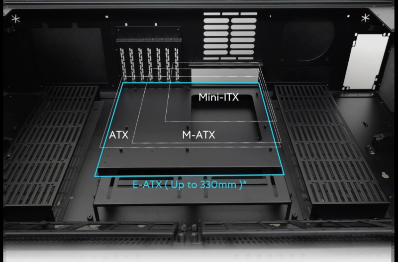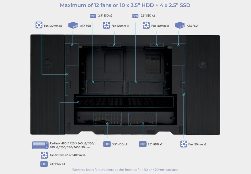 O design modular da mesa proporciona ainda maior flexibilidade e permite a instalação de radiadores de 480 mm ou 420 mm juntamente com radiadores de 240 mm.
