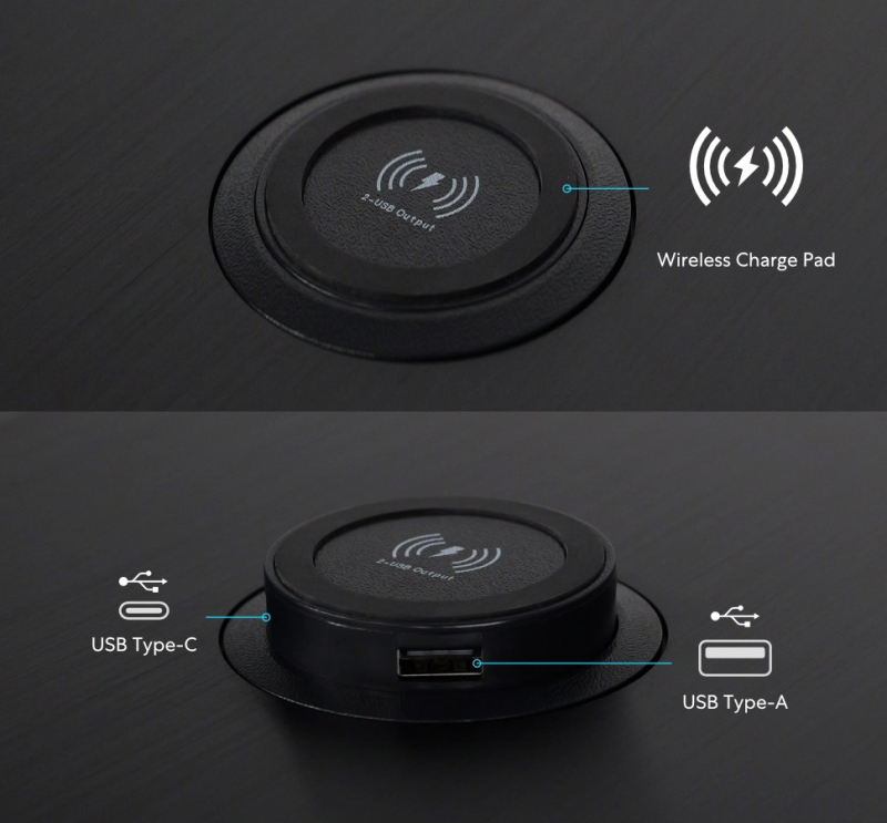 A mesa está equipada com duas gavetas organizadoras para pequenos itens como baterias, cabos diversos e outras coisas. Além disso, o novo produto recebeu carregamento sem fio para dispositivos móveis com portas USB-C e USB-A integradas.