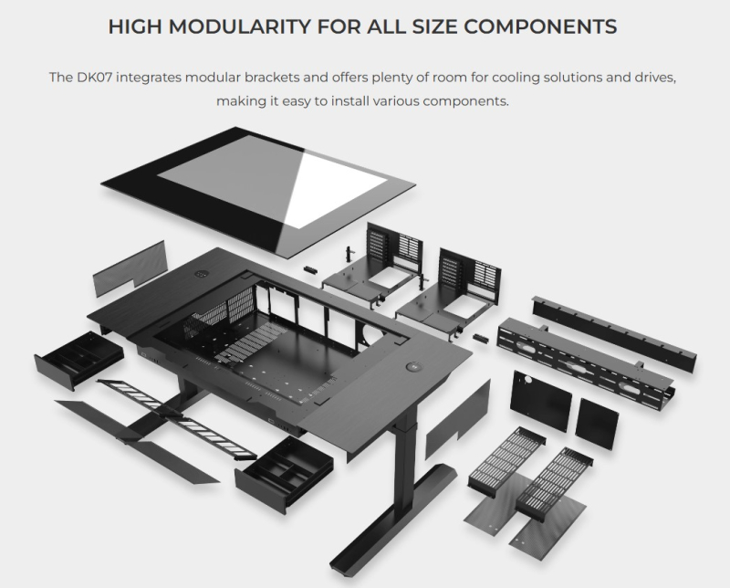 Lian Li DK07 mantém em grande parte a flexibilidade do protótipo apresentado em fevereiro deste ano em termos da capacidade de equipá-lo com os componentes informáticos mais avançados. O novo produto tem design modular e duas bandejas extraíveis para placas-mãe, o que simplifica a instalação e troca de equipamentos. Cada sistema possui 7 slots de expansão.