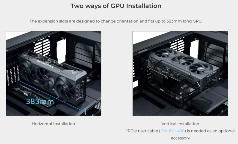 A mesa suporta a instalação de coolers de processador de até 180 mm de altura, fontes de alimentação de até 220 mm de comprimento e placas de vídeo de até 383 mm de comprimento. Para este último, é fornecida a possibilidade de instalação vertical, mas para isso será necessário adquirir um adaptador riser especial.