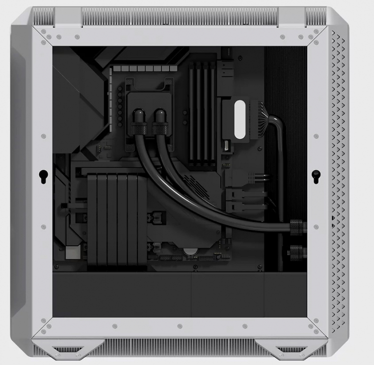 O interior da caixa é dividido em dois compartimentos. Em uma parte, há espaço para uma placa-mãe com processador, memória e SSDs NVMe. A outra parte foi projetada para instalar um acelerador gráfico por meio de um adaptador riser incluído no pacote. By the way, a placa de vídeo através dele é instalado de cabeça para baixo. Além disso, oferece alguns assentos adicionais para unidades de 2,5 polegadas. Assim, um radiador de parede lateral é responsável por resfriar o processador e o segundo – pela placa de vídeo. Entre outras coisas, deve-se notar a possibilidade de instalar uma fonte de alimentação de até 180 mm de comprimento.