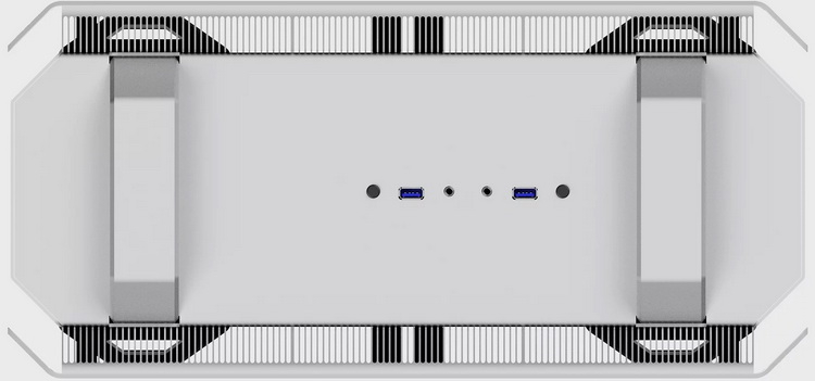 O painel frontal do gabinete é quase surdo, exceto pelos orifícios de ventilação nas laterais. O painel de conectores usual está localizado na tampa superior. Seu conjunto inclui um botão liga / desliga, um conector USB Tipo A e um conector USB Tipo C, além de um par de saídas de áudio de 3,5 mm.