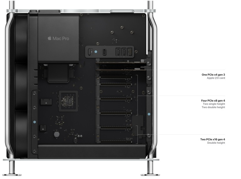 Embora o Mac Pro não suporte placas gráficas discretas, os slots PCIe Gen 4 podem ser usados para conectar placas de rede ou dispositivos de armazenamento, por exemplo. Isso melhorará a capacidade do Mac Pro de trabalhar com grandes quantidades de áudio e vídeo durante a edição em comparação com o Mac Studios mais compacto e acessível.